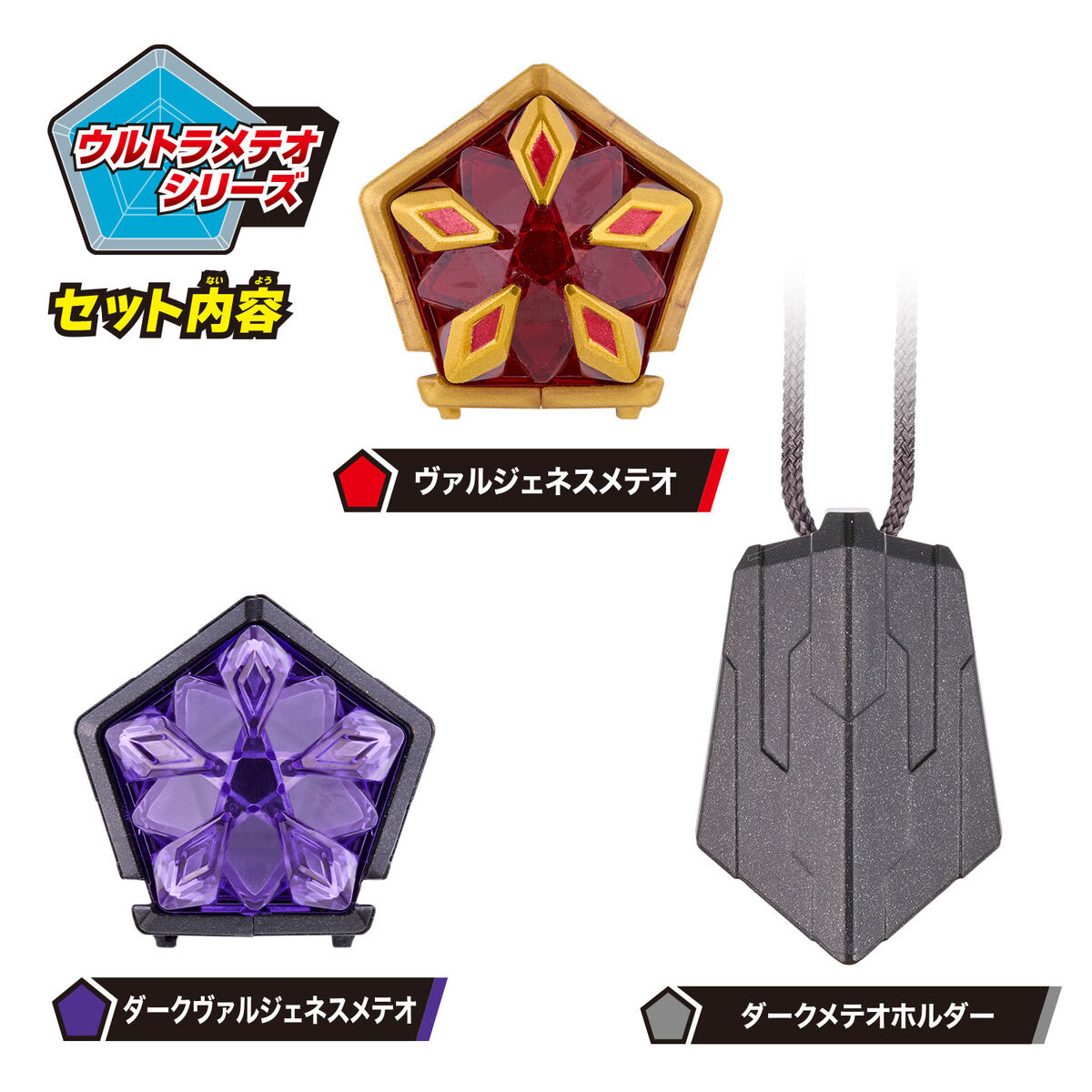 ウルトラマンオメガがヴァルジェネスアーマーへの変身に使用する「ヴァルジェネスメテオ」を含めたウルトラメテオ2種と、「ダークメテオホルダー」がセットになっています。
