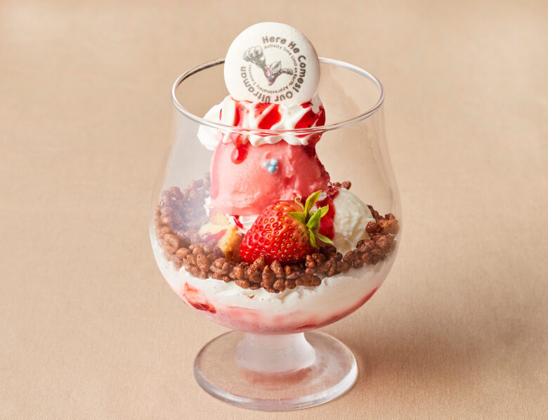ウルトラマンのイメージカラーを赤いソースで表現し、クッキーをトッピングしたいちごパフェです。