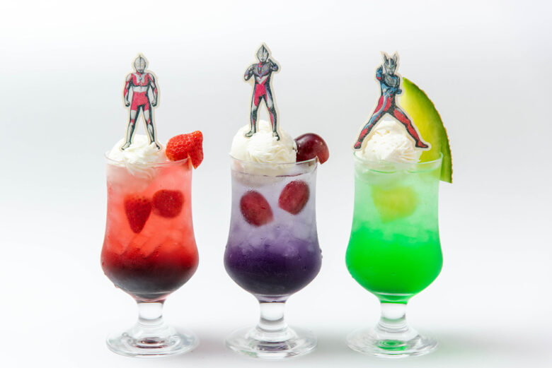 ウルトラマン、ウルトラマンティガ、ウルトラマンゼロのイメージに合わせたクリームソーダです。