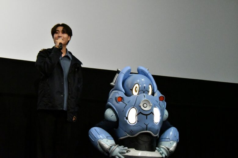 その後、金田さんの提案で『ウルトラマンアーク THE MOVIE』に登場したギルアークを呼ぶことに。悠々とギルアークが登場すると今度は戸塚さんが「もう一人、仲間を呼びたいんだけど……」と提案し、SKIPのメンバーたちと共に活躍したAIロボット・ユピーを呼び込むことに。「ユピーにおまかせ!」というお馴染みのセリフが響き渡り、登壇キャストも会場のファンも誰もがユピーの登場を期待して待っている中、声を務めた声優・広瀬裕也もユピーとともにサプライズで登場しました。