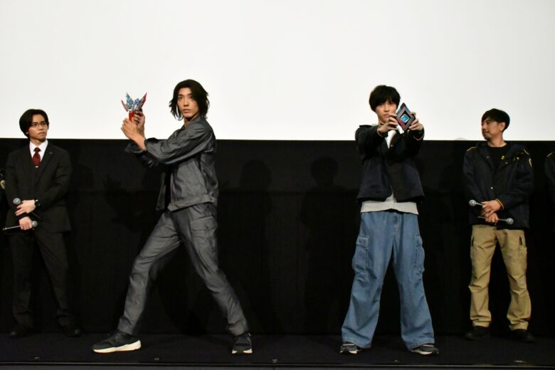 まずは、怪獣防災科学調査所「SKIP 星元市分所」のメンバー、ウルトラマンアークに変身する主人公・飛世ユウマ役の戸塚有輝さん、ユウマの相棒・石堂シュウ役の金田 昇さん、夏目リン役の水谷果穂さん、伴ヒロシ役の西 興一朗さん、そして、辻本貴則監督が登壇。は『ウルトラマンアーク』に詳しい“辻本博士”として挨拶し、詰めかけたファンからの歓迎に笑顔で手を振って応えました。