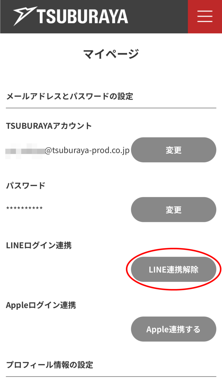 【4】 LINEアカウント連携が成功するとTSUBURAYAアカウントマイページに戻り、 [LINEログイン連携]のボタンが【LINE連携解除】になっていれば連携完了