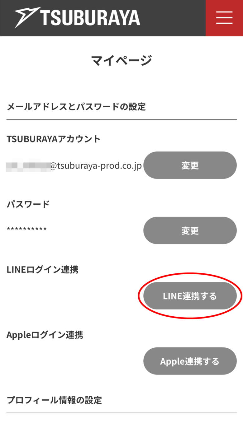 【1】 TSUBURAYAアカウントマイページ「LINEログイン連携」の【LINE連携する】ボタンをタップ