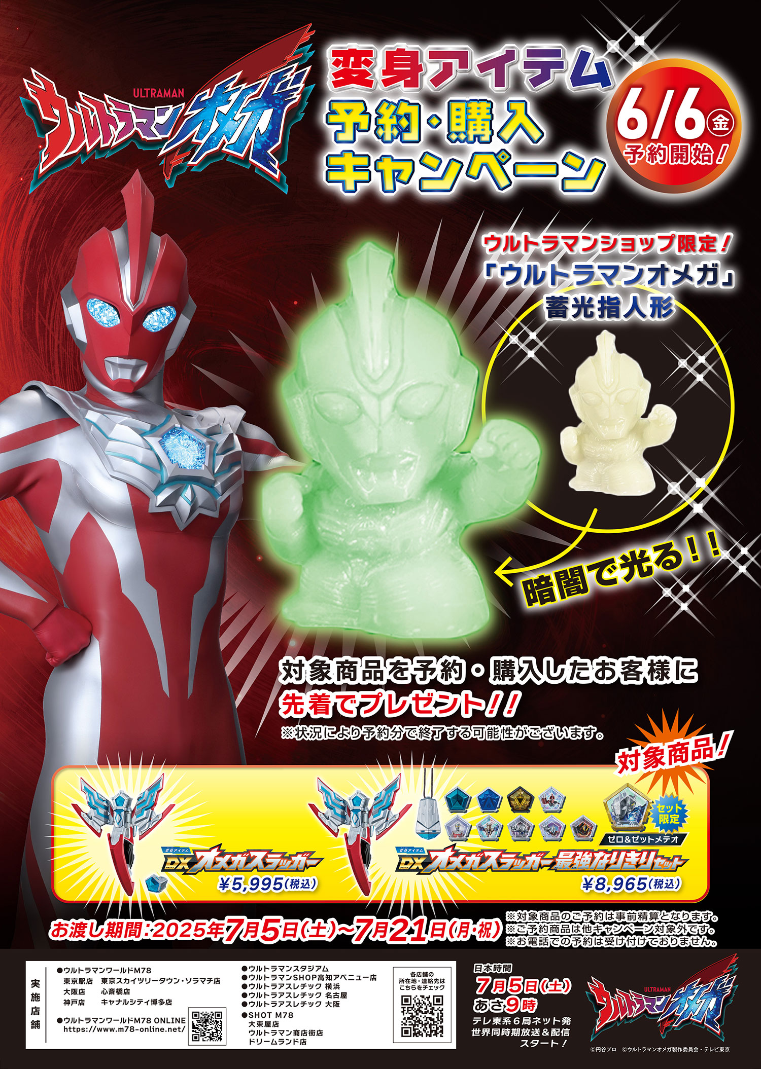 ウルトラマンオフィシャルショップ「ウルトラマンワールドM78」各店ほか、全国の「ウルトラマンショップ」で対象商品を予約・購入すると、限定の「ウルトラマンオメガ蓄光指人形」がもらえます。