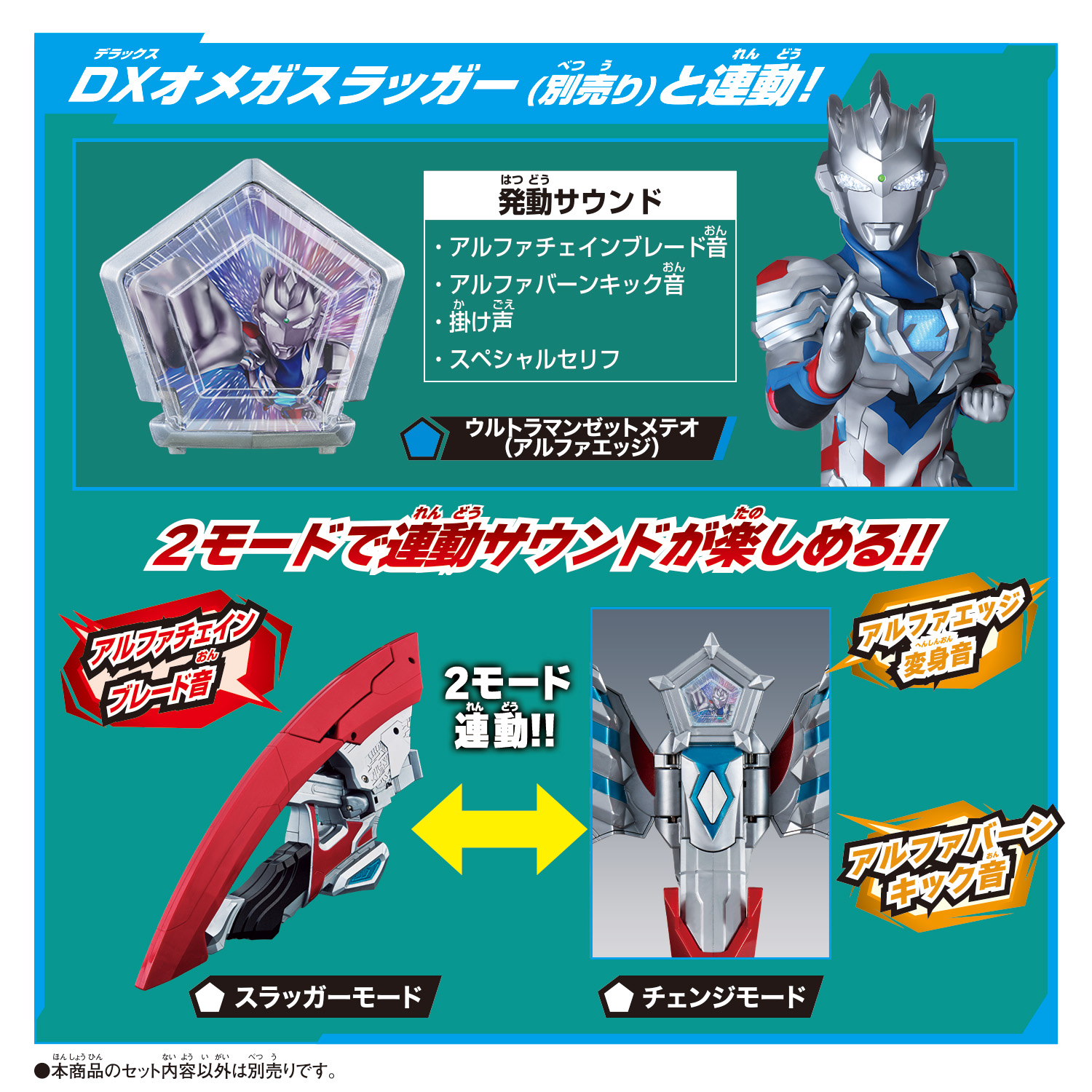 ウルトラメテオは、別売りの「変身アイテム DXオメガスラッガー」と連動して楽しむことができます。