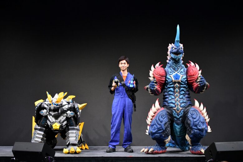 また、本作では主人公ソラトが変身を遂げるウルトラマンオメガだけではなく、メテオカイジュウというオメガの味方をする怪獣の登場も大きな見どころということで話が移ると、コウセイを演じる吉田が「レキネスは人懐っこいんですよ。トライガロンはすばしっこい動きで敵を翻弄します」と、相棒となるメテオカイジュウたちに対して愛情たっぷりの様子で語り、ここで実際にメテオカイジュウたちを呼び出すことに。コウセイの掛け声である「行け!レキネス!」、続けざまに「頼んだぞ!トライガロン!」と吉田さんが発すると、2体のメテオカイジュウが登場! 初登場となる迫力満点の頼もしいパートナー怪獣たちの姿に会場もくぎ付けとなりました。