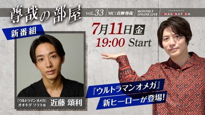 2025年7月のMONTHLY ONLINE LIVEは、青柳尊哉さんがMCを務める「尊哉の部屋」です。ゲストには、7月5日(土)より放送開始となる新番組『ウルトラマンオメガ』主人公・オオキダ ソラト役を演じる近藤頌利さんをお迎えします。