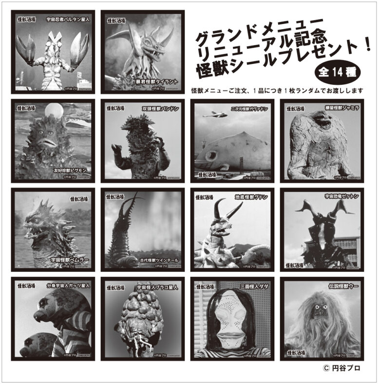 グランドメニューリニューアルを記念して、メニューのテーマとなった怪獣・宇宙人たちの「怪獣シール」をプレゼントします。