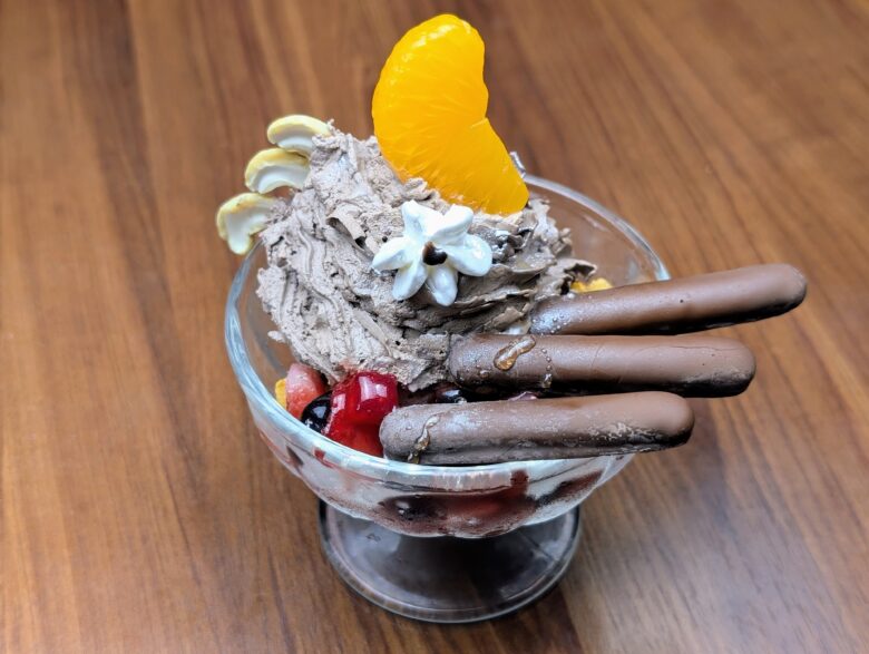 チョコレートをふんだんに使い、溶鉄(?)も添えられたスパークドールズパフェ。