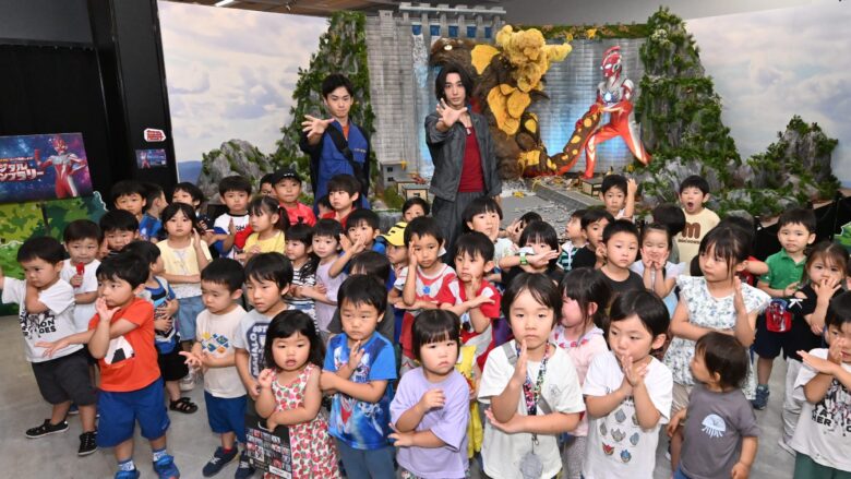 オープニングセレモニーは、会場近隣で招待された子どもたちの元気な声が飛び交う中で幕を開けました。ステージイベントの前には、放送が開始されたばかりの『ウルトラマンオメガ』の展示ブースを背景に、近藤さんと吉田さんが子どもたちと共に写真撮影を行い、交流しました。