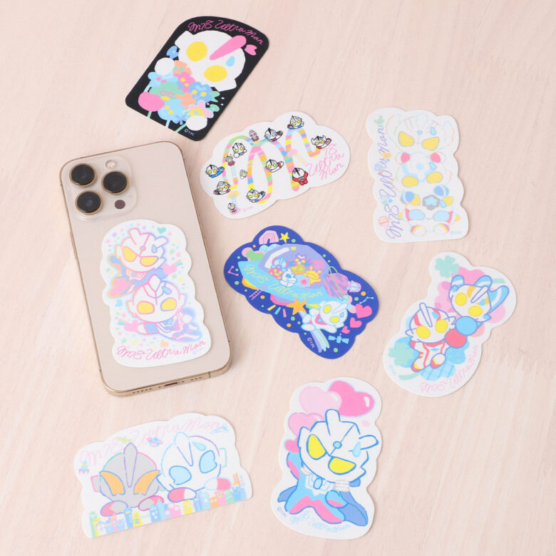 FLOWERは白地を基調にウルトラヒーローやダークヒーロー、ポップなお花をあしらい、シンプルでなじみやすいデザインに仕上げました。TOWNは街中のウルトラヒーローたちのようすを表現した全面デザインで、シンプルな手帳やステーショナリーなどに貼るだけで小物が華やかになります。