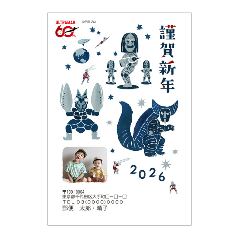 最新ヒーロー・ウルトラマンオメガやお馴染みのウルトラ怪獣、『かいじゅうステップ ワンダバダ』のかいじゅう達など、お子様や家族の写真を入れてお送りする写真年賀状もご用意しております。