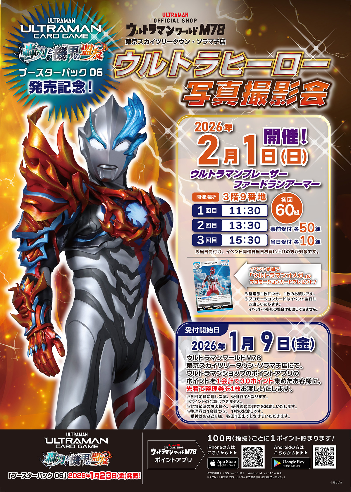「ウルトラマン カードゲーム」ブースターパック06「轟刃と機甲の盟友」の2026年1月23日(金)発売を記念するウルトラヒーロー写真撮影会が、公式ショップ「ウルトラマンワールドM78」の2店舗で実施されます。