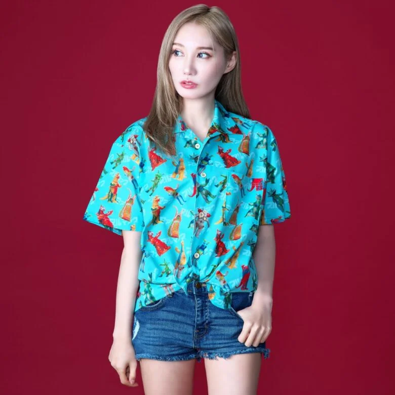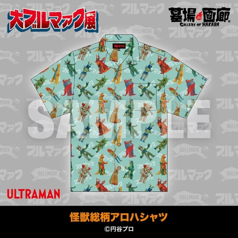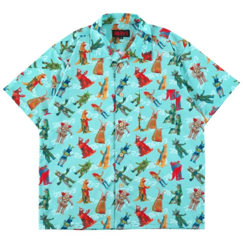「カネゴン」「バルタン星人」「キングジョー」をはじめとするブルマァクの人気ソフビが、爽やかなミントグリーンのアロハシャツに散りばめられたデザインです。