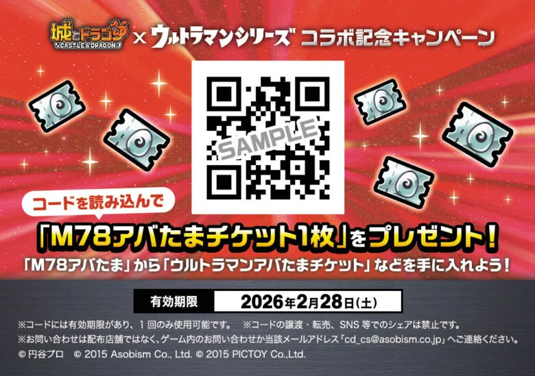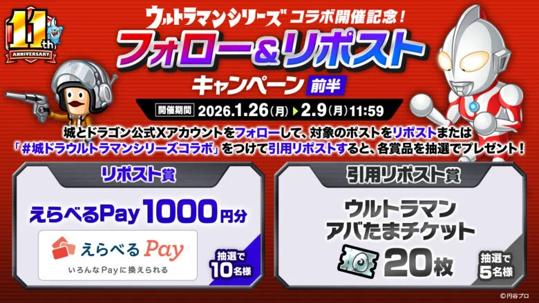 - [2] キャンペーン対象ポストをリポストまたはハッシュタグ「#城ドラウルトラマンシリーズコラボ」をつけて引用リポスト