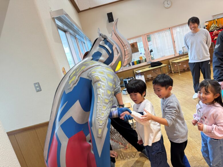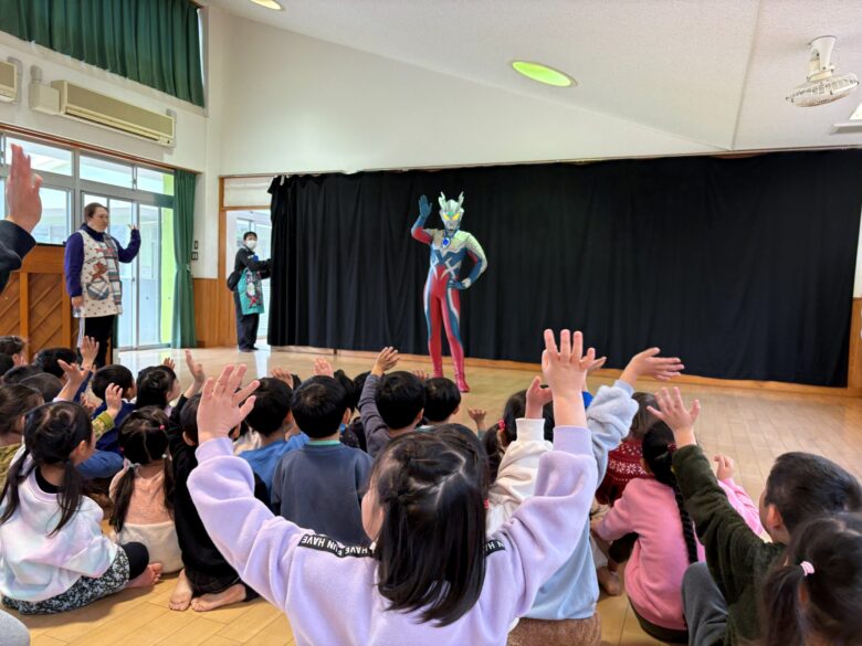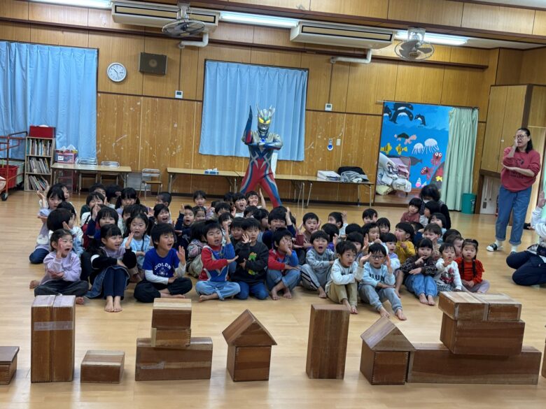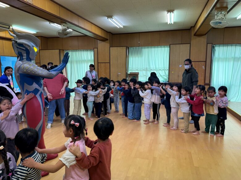 台風の影響により地域全体が大きな影響を受ける中で実現した今回の訪問に、保育園にいる子どもたちは大歓声でウルトラマンゼロを迎えてくれました。園内では体を動かすゲームや、写真撮影、ハイタッチなどを約30分間の交流が行われ、園内は笑顔と元気一杯の声に包まれました。