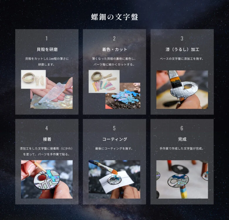 本品は、この螺鈿細工を用い、職人の手作業によって一枚一枚丁寧に文字盤を仕上げています。