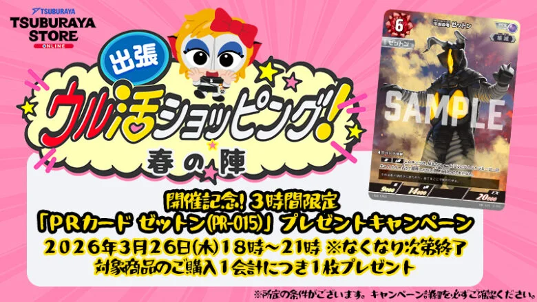 対象商品をお買い上げのご注文1件につき「ウルトラマン カードゲーム PRカード ゼットン(PR-015)」1枚付与(注文回数の上限はございません)