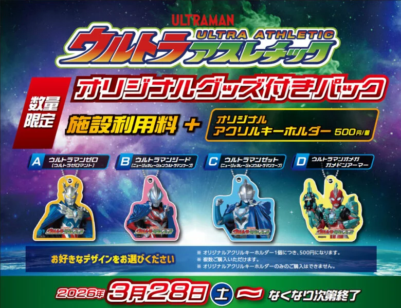 「ウルトラアスレチック」の入場料+500円で、オリジナルアクリルキーホルダー(4種のうち1種)をもらえる料金プランがスタートします。