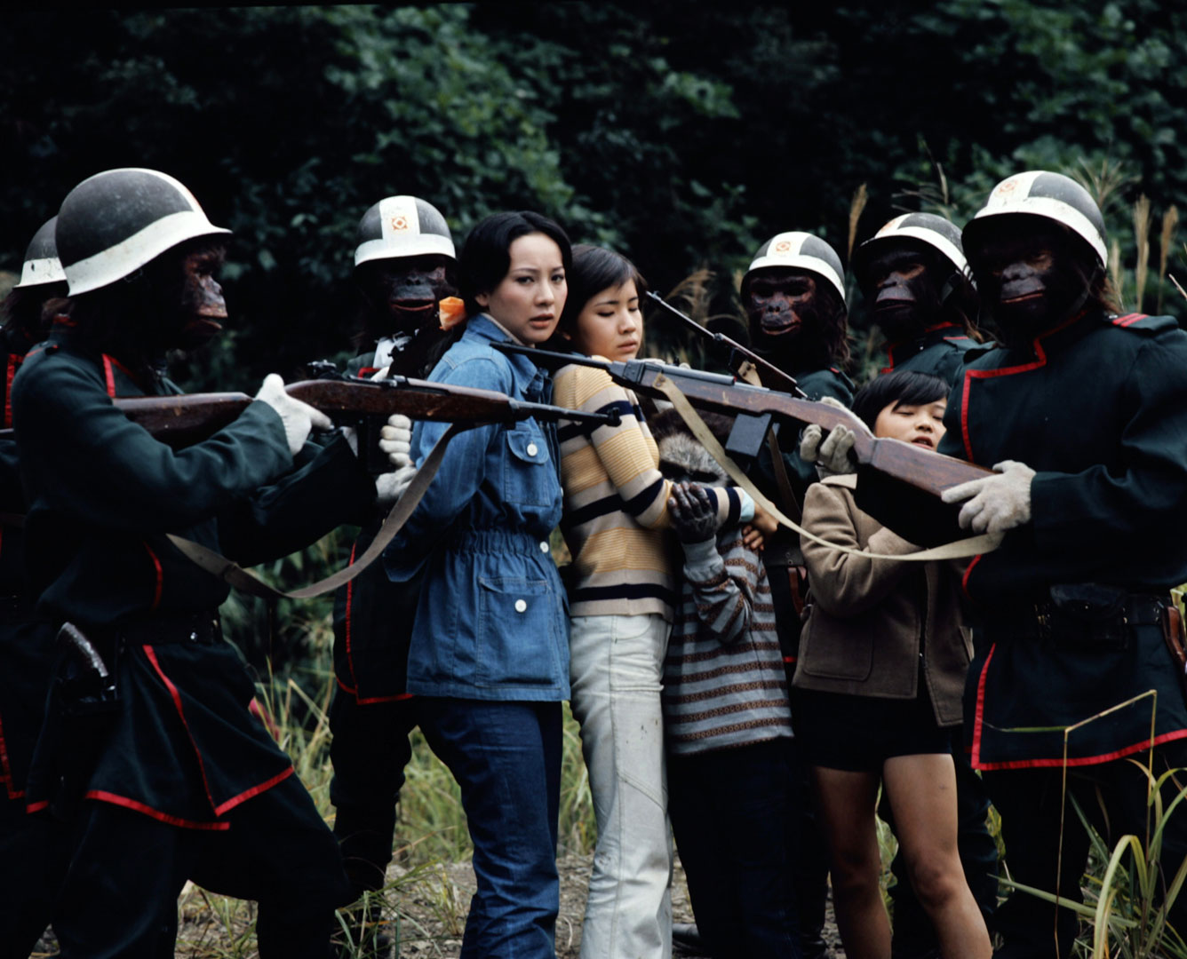 SFドラマ 猿の軍団 トップ 作品あらすじ 場面写真作品あらすじ低温性化学研究所の研究員・泉和子、研究所所長の甥・榊次郎、その友人・ユリカは、突然の大地震により、コールドスリープ装置に閉じ込められ、冷凍睡眠に入ってしまう。彼女ら3人が目覚めたのは、猿が文明を築き地球の支配者となった、はるか未来の世界だった。猿たちはその種類によっていくつかの派閥に分かれ、考えの違いによって対立。和子たちは、多くの出会いと別れを経て、人類滅亡の謎へと迫っていく。場面写真 次へ 前へ